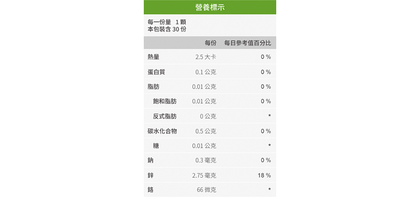功效成分:菊苣纖維、專利固態培育冬蟲夏草菌絲體、專利苦瓜萃取粉、酵母鋅、酵母鉻